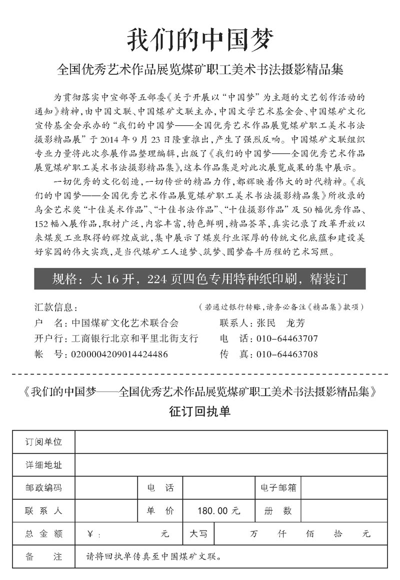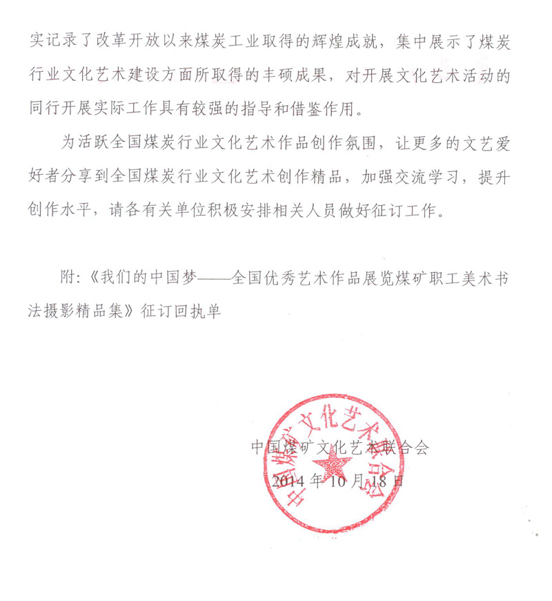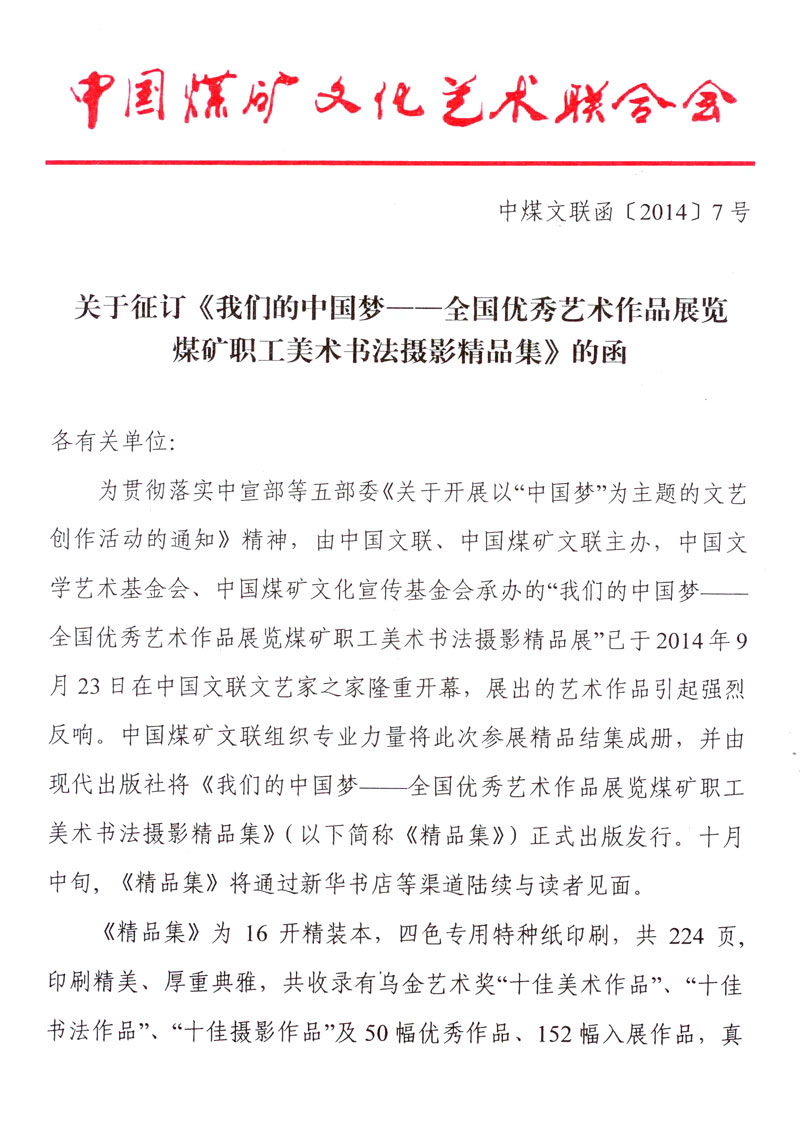 關于征訂《我們的中國夢——全國優秀藝術作品展覽煤礦職工美術書法攝影精品集》的函