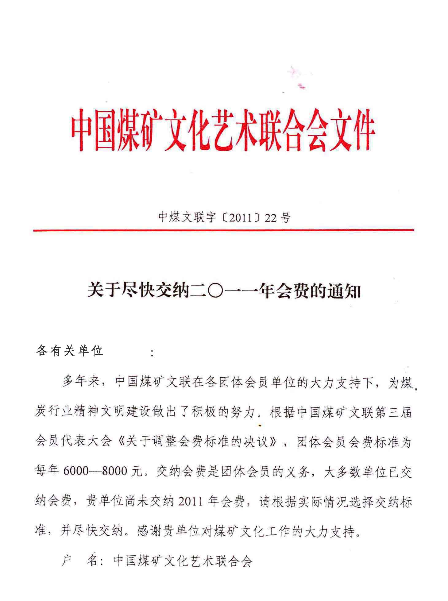 關(guān)于盡快交納二〇一一年會(huì)費(fèi)的通知 來(lái)源:中國(guó)煤礦文化網(wǎng) 作者:煤礦文聯(lián) 時(shí)間:2011-12-22 【字體:小 大】 分享到: 【打印正文】