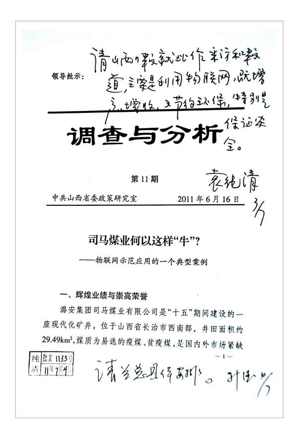 2011年4月,山西省委書記袁純清對司馬煤業的物聯網技術做出重要批示:“請《山西日報》就此作采訪和報道,主要是利用物聯網,既增產增效,又節約環保,特別是保證安全。”7月,《山西日報》頭版頭條刊發長篇通訊《司馬奇跡》,全面介紹了司馬煤業的物聯網技術,“司馬奇跡”由此得名。