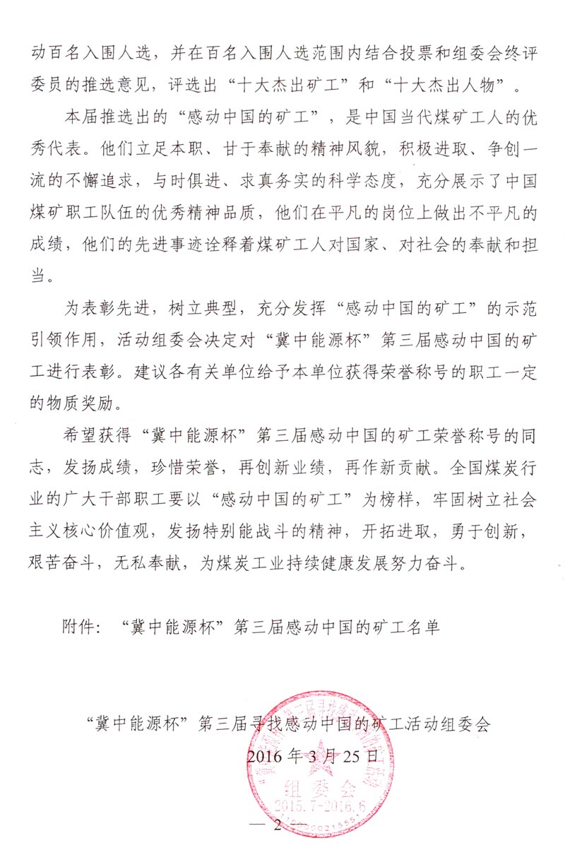 關(guān)于表彰“冀中能源杯”第三屆感動(dòng)中國的礦工的決定 來源:“冀中能源杯”第三屆尋找感動(dòng)中國的礦工活動(dòng)組委會 作者: 時(shí)間:2016-05-19 【字體:小 大】 附件:“冀中能源杯”第三屆感動(dòng)中國的礦工名單 分享到: 【打印正文】
