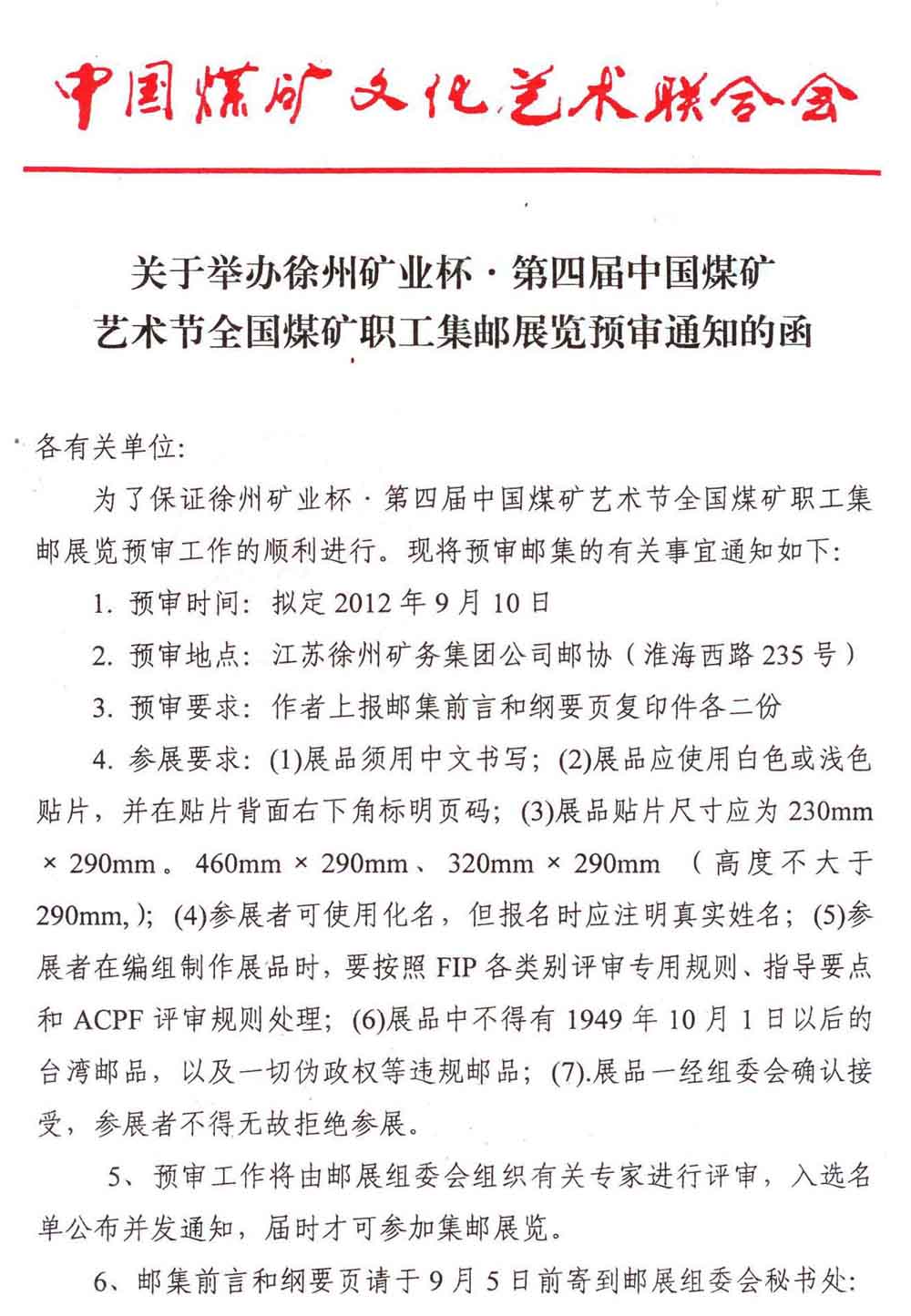 關于舉辦徐州礦業(yè)杯·第四屆中國煤礦藝術節(jié)集郵展覽預審通知的函