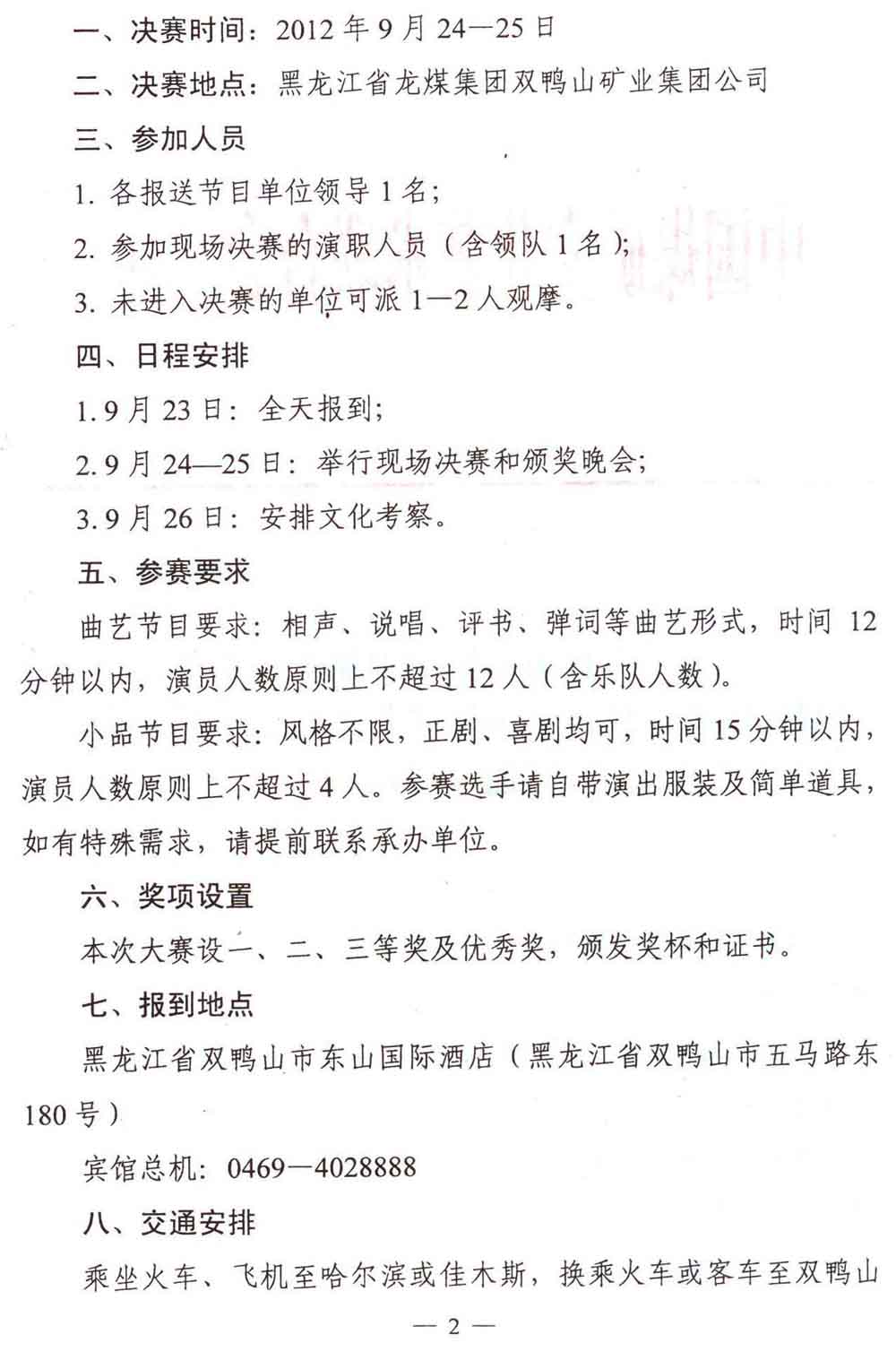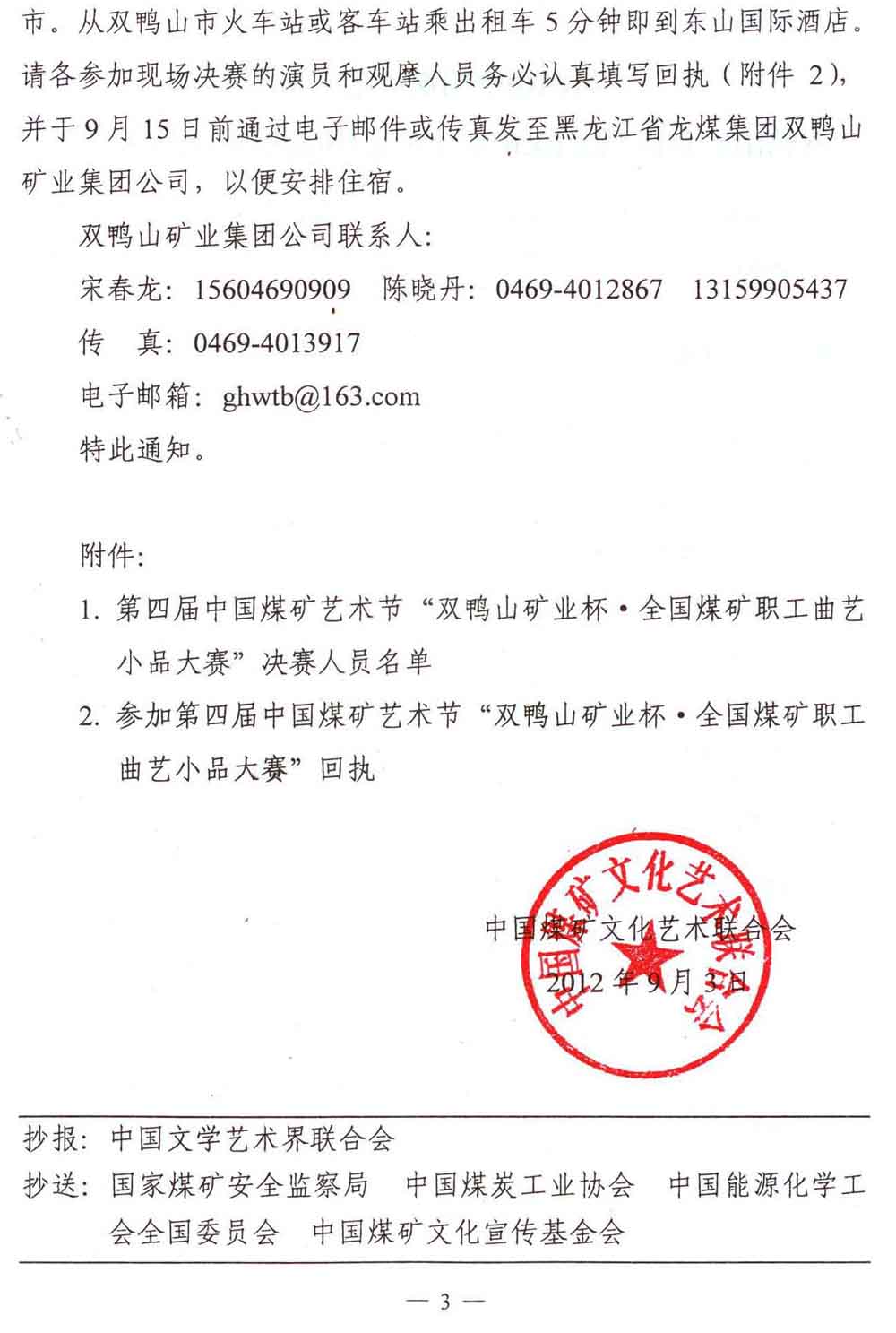 關于舉行第四屆中國煤礦藝術節“雙鴨山礦業杯·全國煤礦職工曲藝小品大賽”的通知 來源:中國煤礦文化網 作者: 時間:2012-09-07 【字體:小 大】 附件:參加第四屆中國煤礦藝術節雙鴨山礦業杯全國煤礦職工曲藝小品大賽回執 分享到: 【打印正文】
