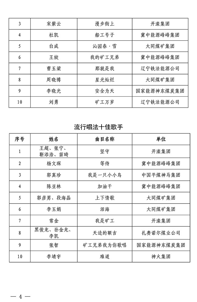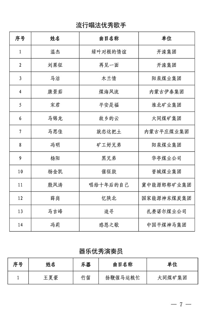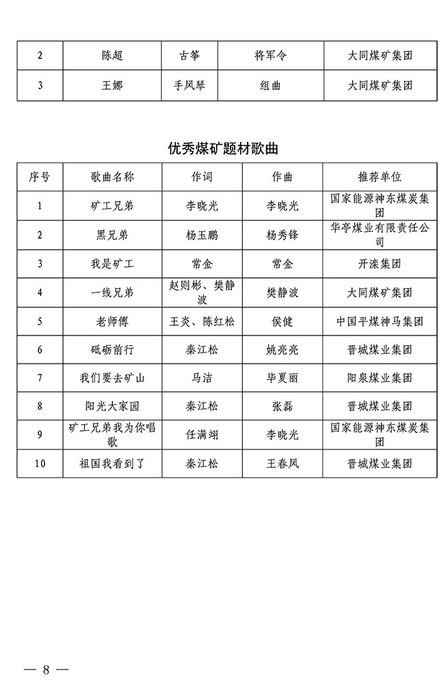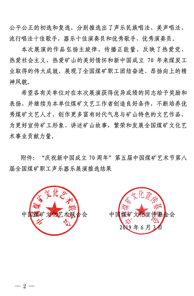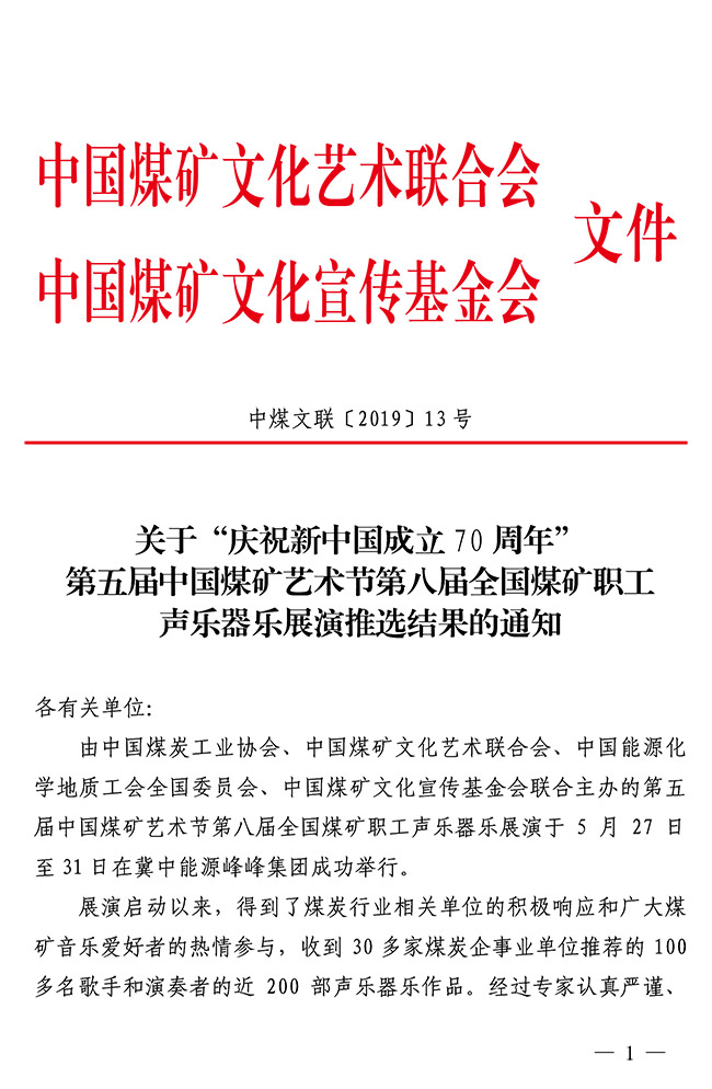關(guān)于第八屆全國煤礦職工聲樂器樂展演推選結(jié)果的通知 來源:中國煤礦文聯(lián) 作者: 時(shí)間:2019-06-13 【字體:小 大】 關(guān)于“慶祝新中國成立70周年”第五屆中國煤礦藝術(shù)節(jié)第八屆全國煤礦職工聲樂器樂展演推選結(jié)果的通知(PDF版) 智能標(biāo)簽: 中國煤礦文聯(lián) 相關(guān)內(nèi)容 分享到: 【打印正文】
