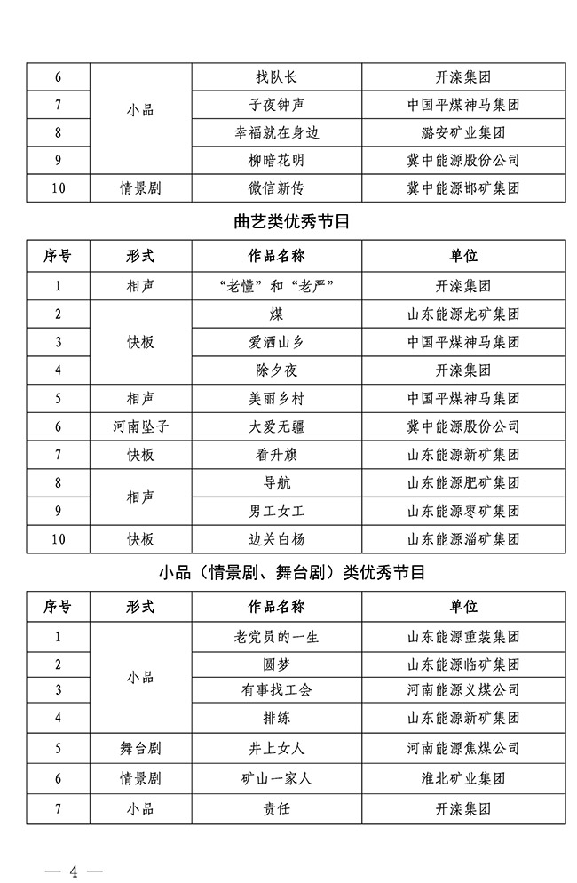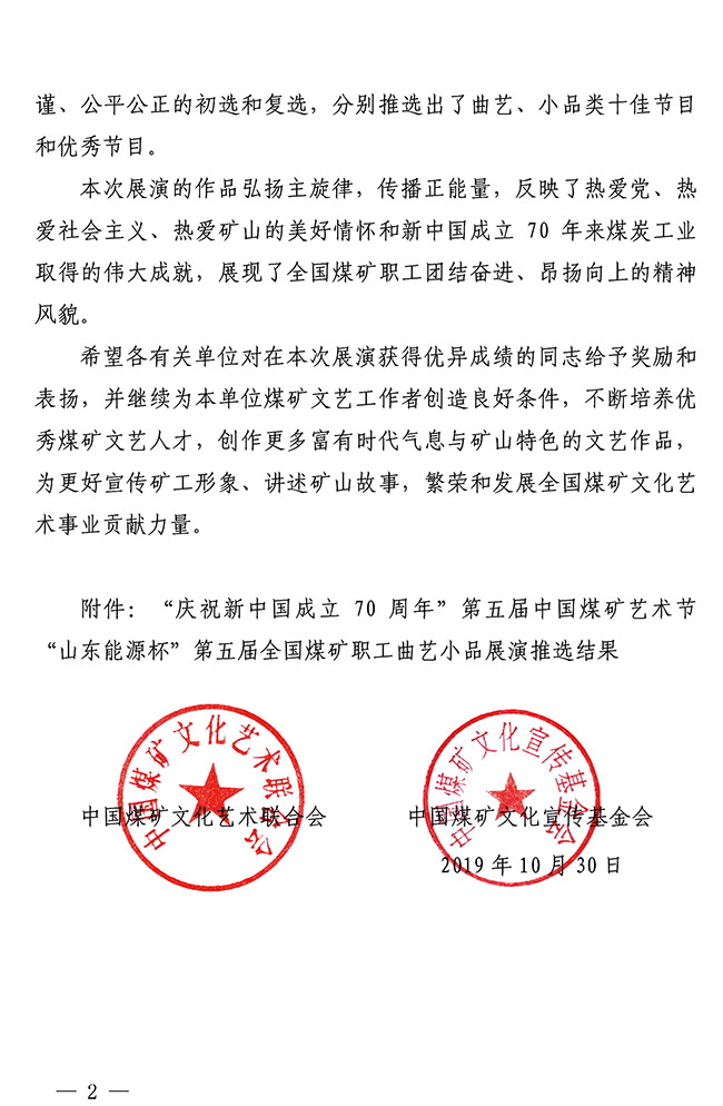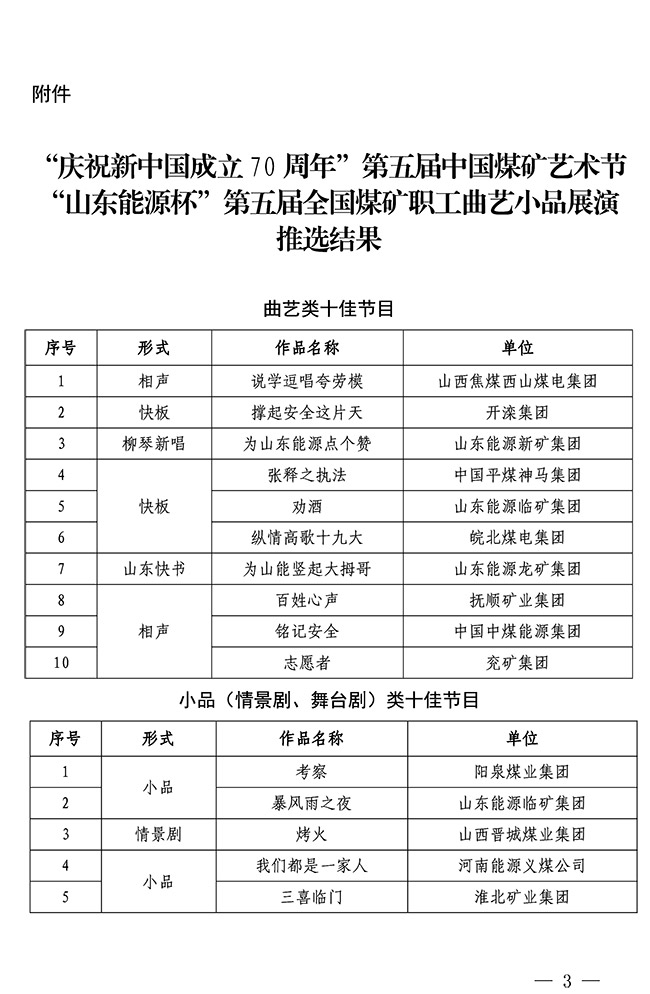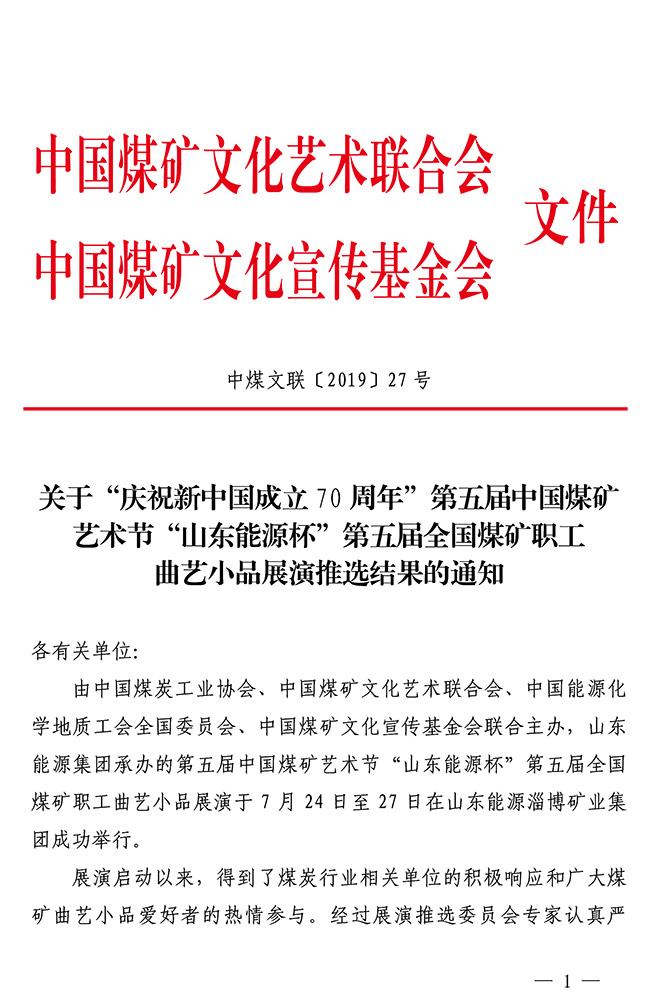 關于“慶祝新中國成立70周年”第五屆中國煤礦藝術節“山東能源杯”第五屆全國煤礦職工曲藝小品展演推選結果的通知 來源:中國煤礦文聯 作者: 時間:2019-10-30 【字體:小 大】 關于“慶祝新中國成立70周年”第五屆中國煤礦藝術節“山東能源杯”第五屆全國煤礦職工曲藝小品展演推選結果的通知(PDF版) 智能標簽: 中國煤礦文聯 中國煤礦藝術節 相關內容 分享到: 【打印正文】