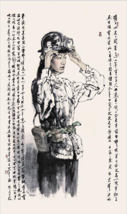 我們這次面對一線礦工和勞模直接寫生,是一次獨特的藝術和生活體驗。礦工們由于體力勞動和工作狀態的單純,在精神風貌和形象特征上有著特有的風采。他們的工作裝束雖然多年來大致不變,但使用材料和外觀設計上卻有許多變革和升華之處,如礦工帽原是用柳條編的,現在用的是耐抗壓的輕型塑料;礦燈也由以前的單一蓄電池改為長效可控3個光源頻段的燈;其他如現代化的防塵、電子報警跟蹤裝置更是以前所沒有的。這些工作裝束使我們一看就是印象中的礦工,大家畫起來也饒有興致。