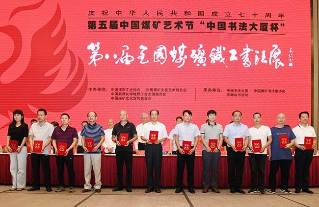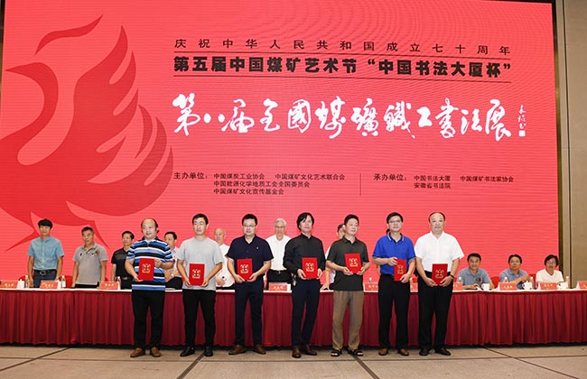 8月23日,由中國煤炭工業協會、中國煤礦文化藝術聯合會、中國能源化學地質工會全國委員會、中國煤礦文化宣傳基金會聯合主辦,中國書法大廈承辦的“慶祝新中國成立七十周年”第五屆中國煤礦藝術節“中國書法大廈杯”第八屆全國煤礦職工書法展覽在安徽省合肥市隆重開幕。中國文聯全國委員會委員、中國煤炭工業協會黨委書記梁嘉琨,中國煤礦文聯副主席張強,中國書法大廈藝委會負責人、安徽省書法院院長李士杰,中國煤礦書協主席張宇,中國煤礦書協主席團成員、有關煤炭企事業單位文藝工作負責人和部分書法展覽作者等500多人參加開幕式。