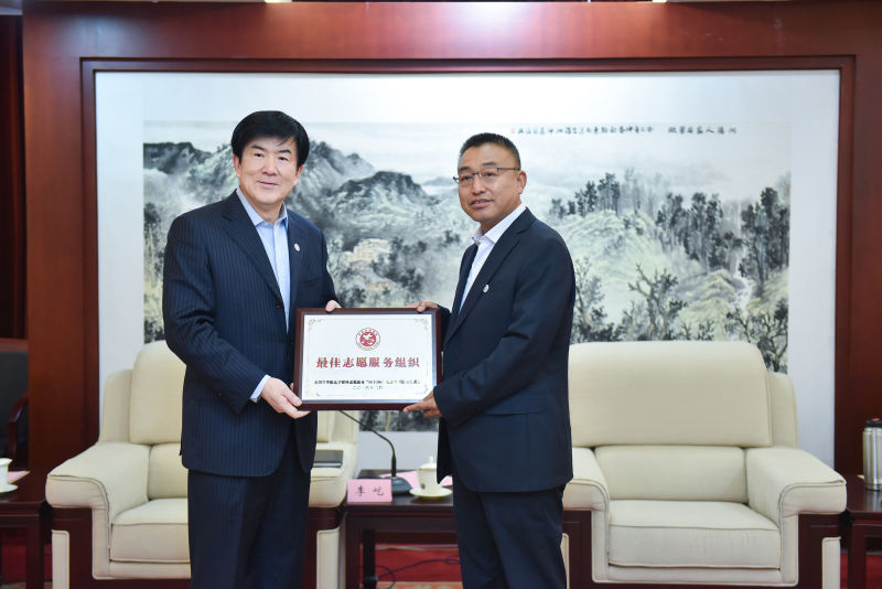 中國文聯黨組書記、副主席李屹(左)向同煤集團文體發展中心主任、文藝志愿者協會主席楊占先(右)頒發“最佳志愿服務組織”獎牌